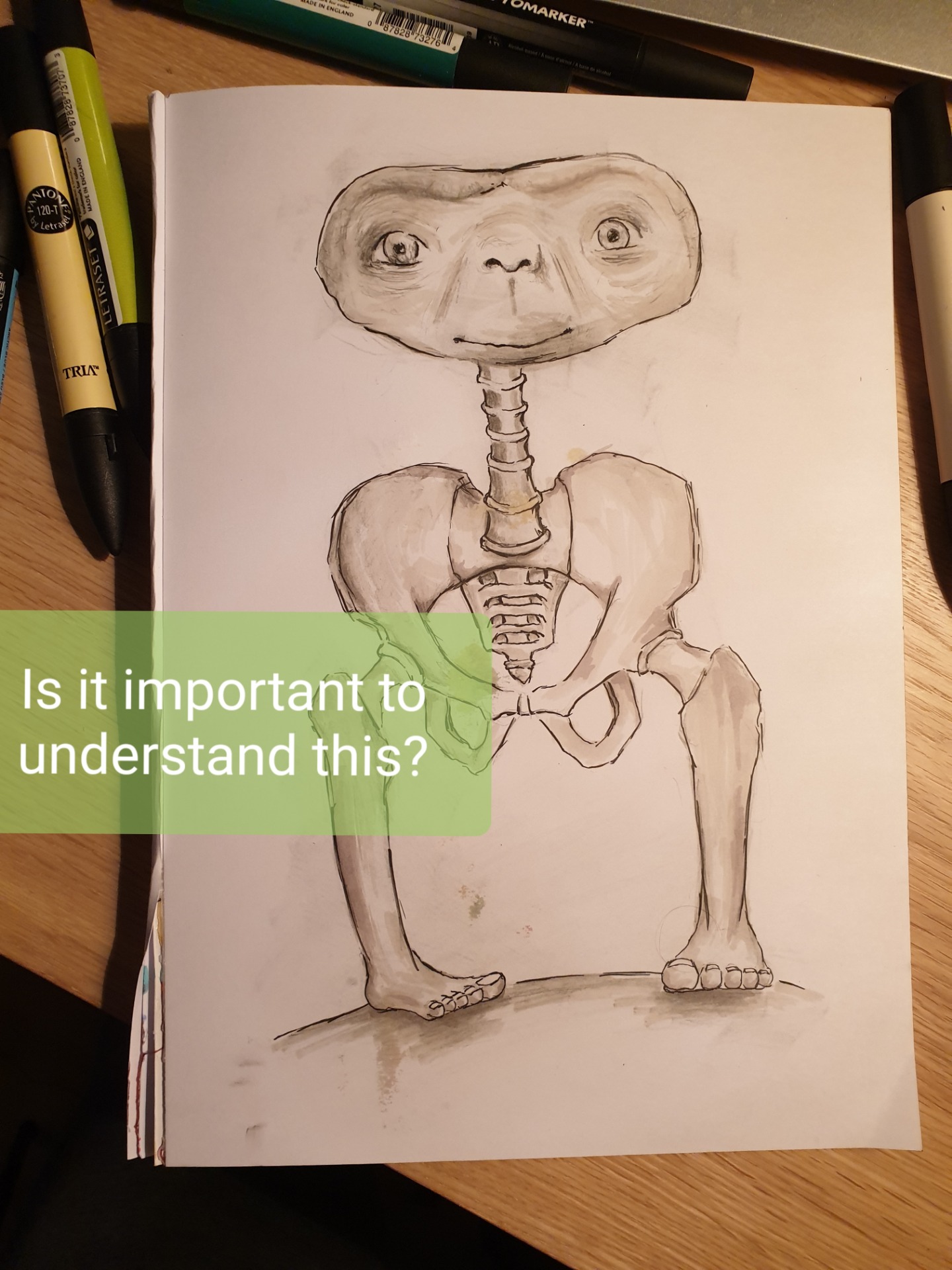 Og i det dette vesenet sakte men sikkert dukker opp fra det hvite arket så popper setningen "is it important to understand this" opp, et ordtak på en kjøleskap magnet jeg har som jeg kjøpte på Nobel senteret i Oslo, hvor jeg også kjøpte meg en penn med ordtaket "how do you write peace" på, men det en annen rant.